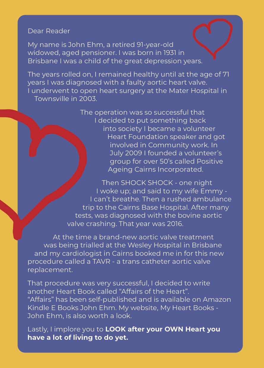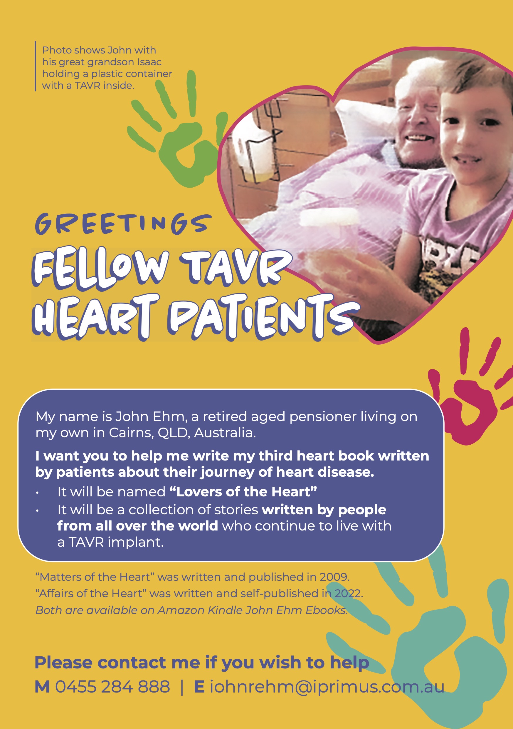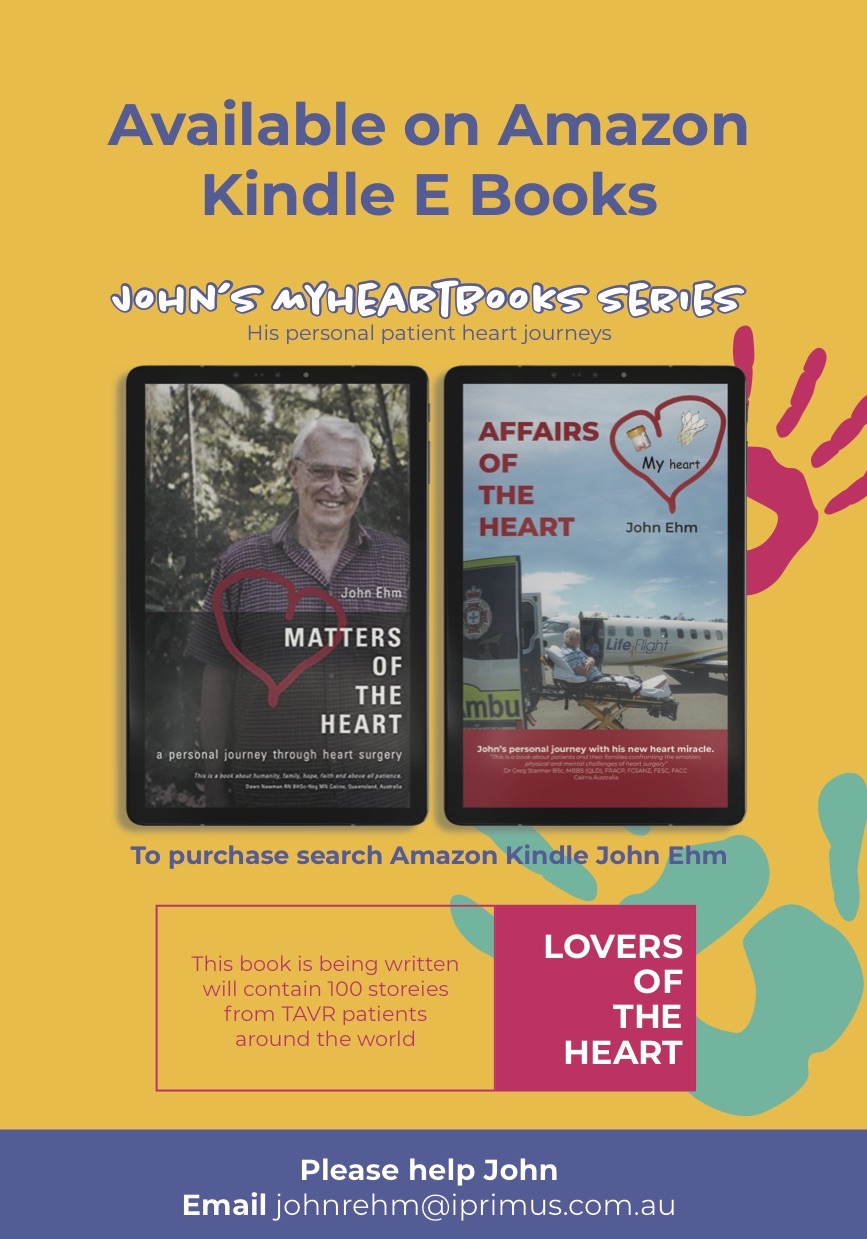 The writing was prompted by my first heart operation, open heart trauma surgery in 2003 to receive a bovine aortic valve for my failing human heart one, which had beat continuously for nearly 71 years without any problems. A wonderful success that led me to writing my first heart book. Well that bovine valve served me well for the next 13 years doing community work in and around the City of Cairns. Then, all of a sudden in a few days it broke down and I was rushed to hospital and underwent a TAVR procedure.