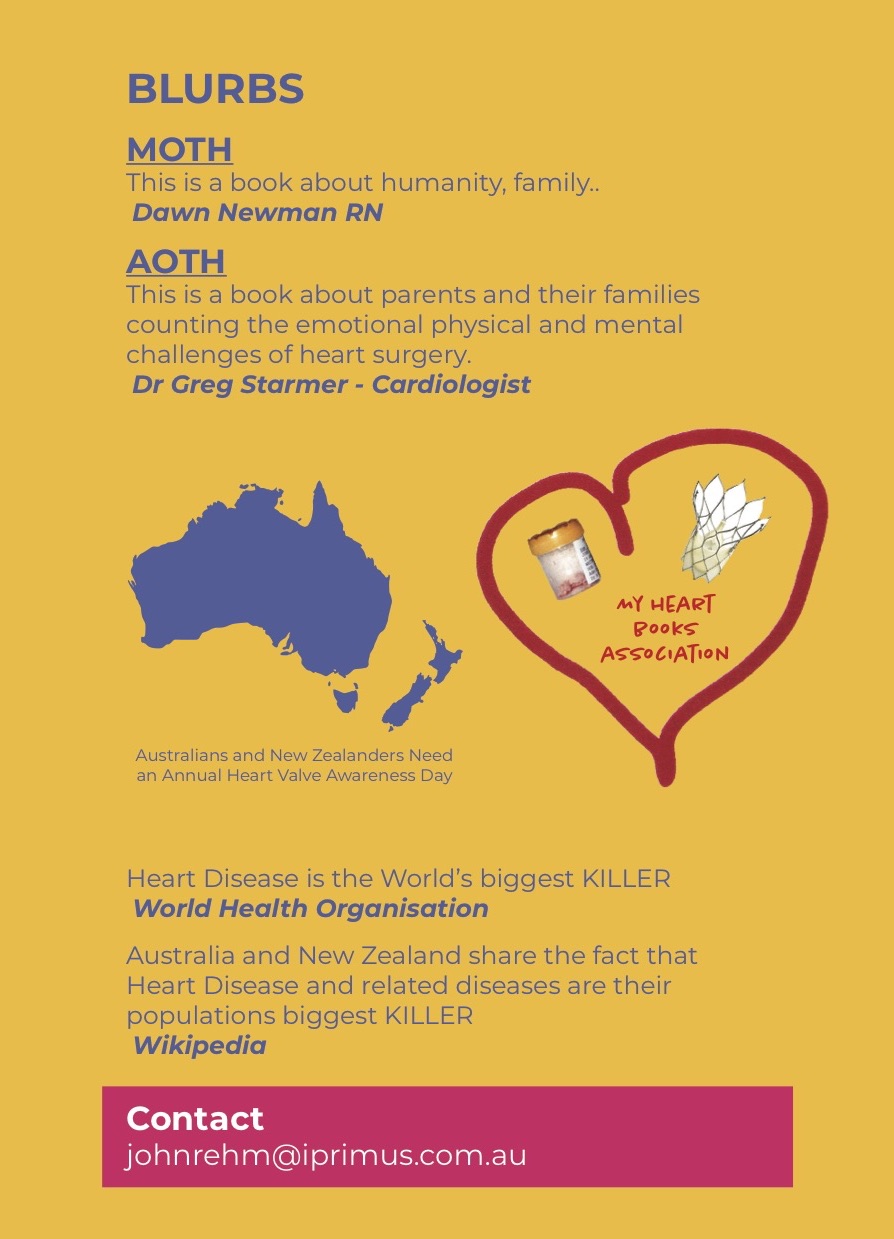 My first heart book is called “Matters of the Heart”, you can catch it on my website – www.mothmatters.com.au It is easy to read and relate to as it was written by a patient telling of his own heart journey from early diagnosis to rehabilitation return to a healthy and active lifestyle. With photos, cartoons and helpful information, a person who is facing surgery can easily relate to the human feelings, even though in these intervening years the advances in medical treatments are far superior to that given to patients in the year 2003.